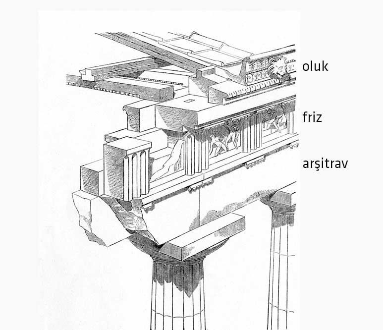 Arşitrav ile korniş arasında yer alan, kabartmalarla bezeli ya da düz şerit şeklindeki bantlardır. Klasik mimarlığın bir öğesi olan friz, portik ve alınlık süslemesi için kullanılırdı. Duvarın üst kısmında, alınlığın hemen altında uzanan bu şerit üzerine imparatorların hayatı veya savaş başarıları betimlenerek süsleme yapılmıştır.